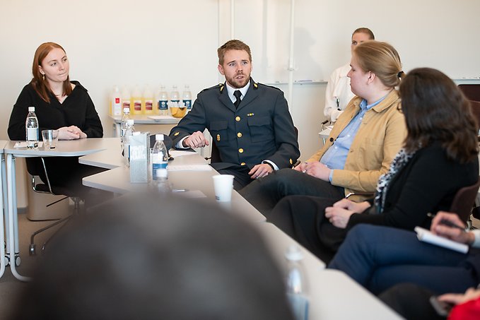 Utbildningsministern i samtal med studenter på masterprogrammet Politik, säkerhet och krig